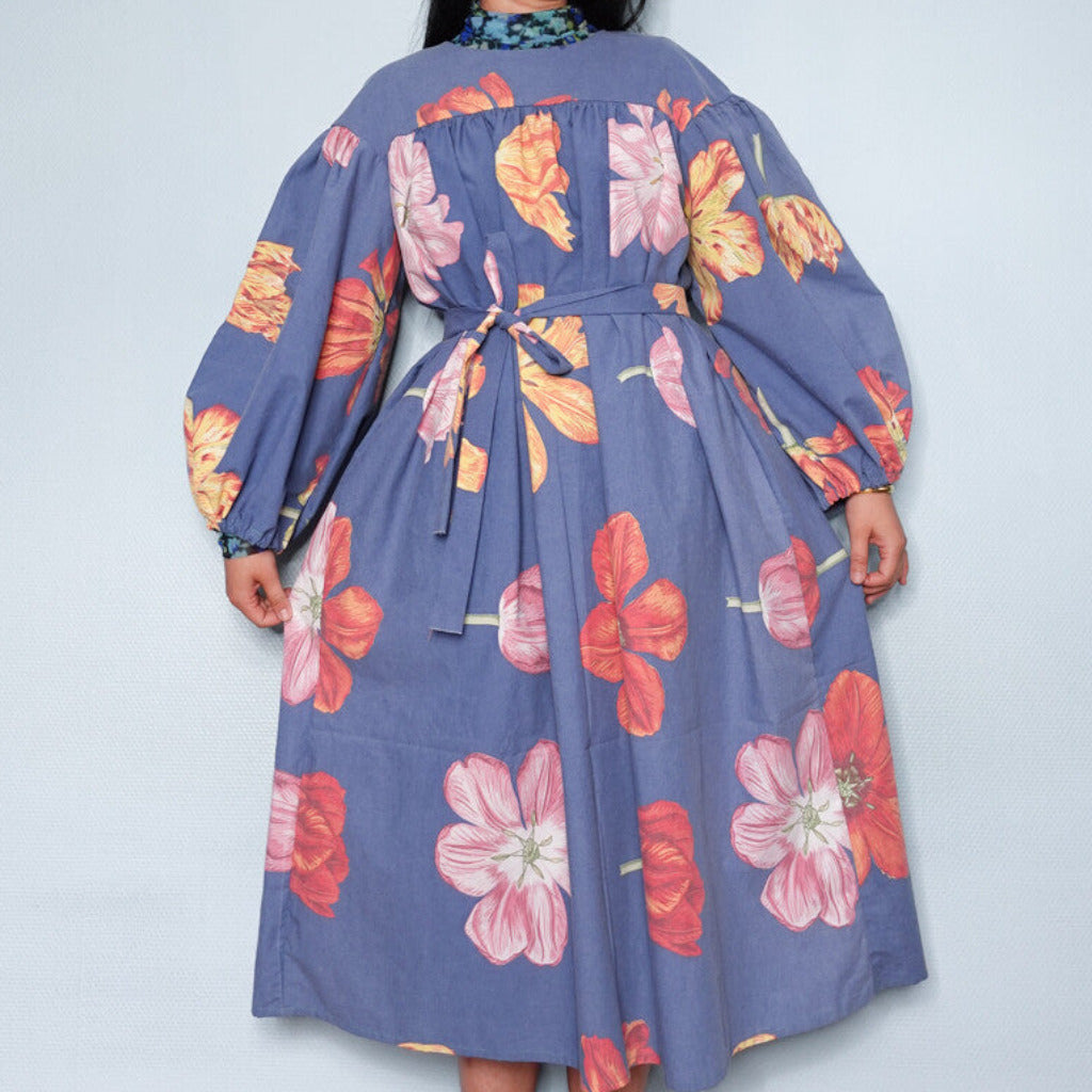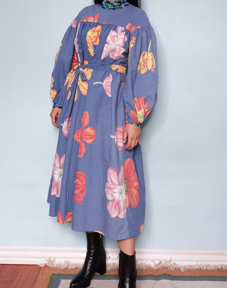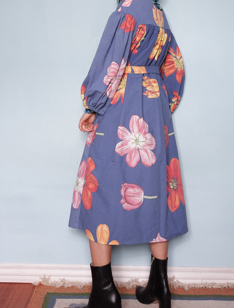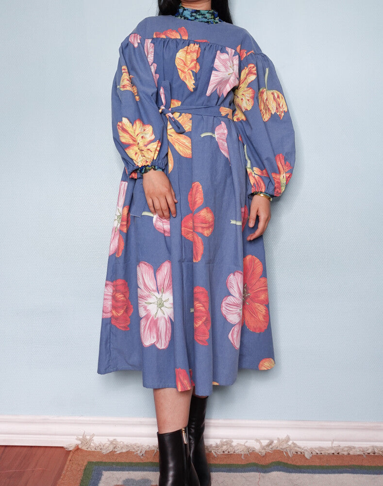 This particular dress is made of a secondhand duvet cover, 100% light cotton, amazing blue color with big flowers, a rare pattern to come across in the redesign market. The dress comes with a matching belt and the length can be altered as wished. The model is size 38/M, 166cm.