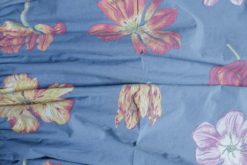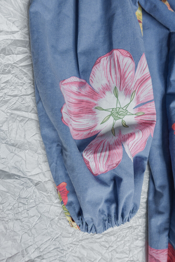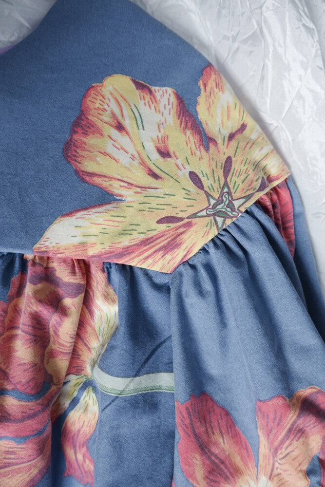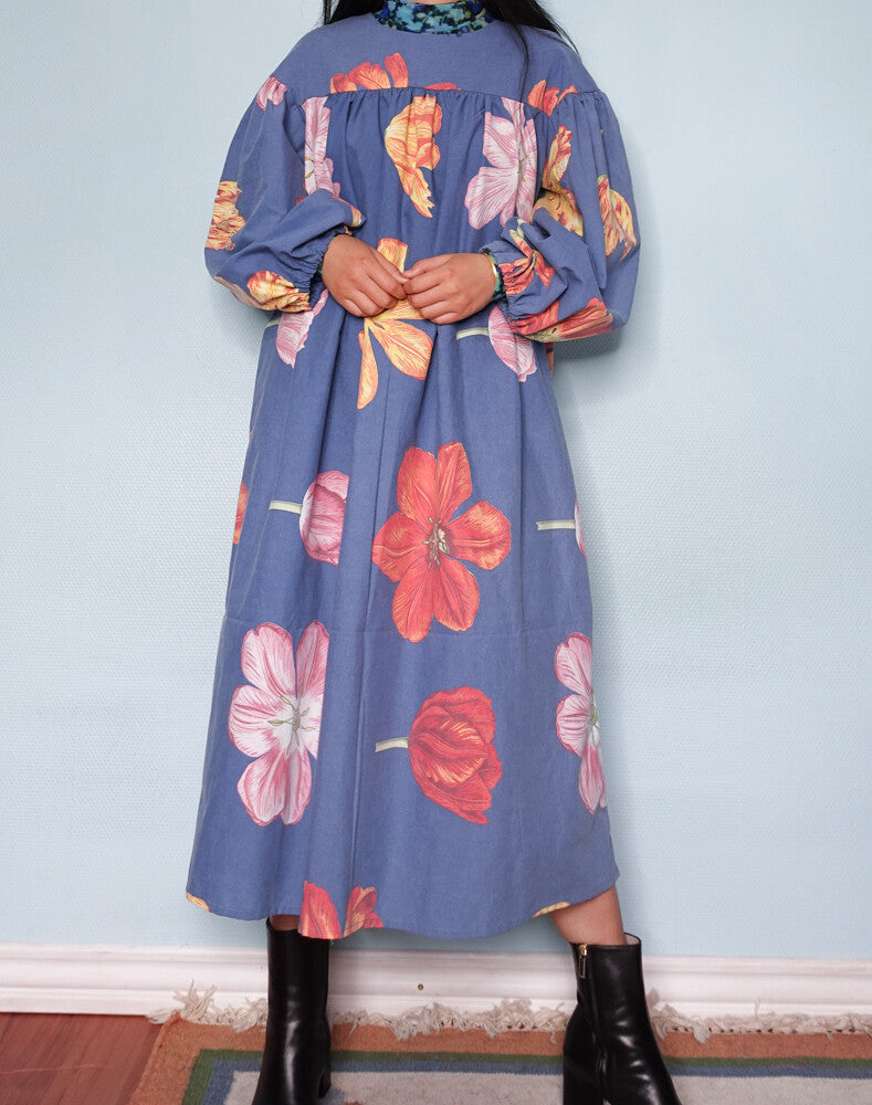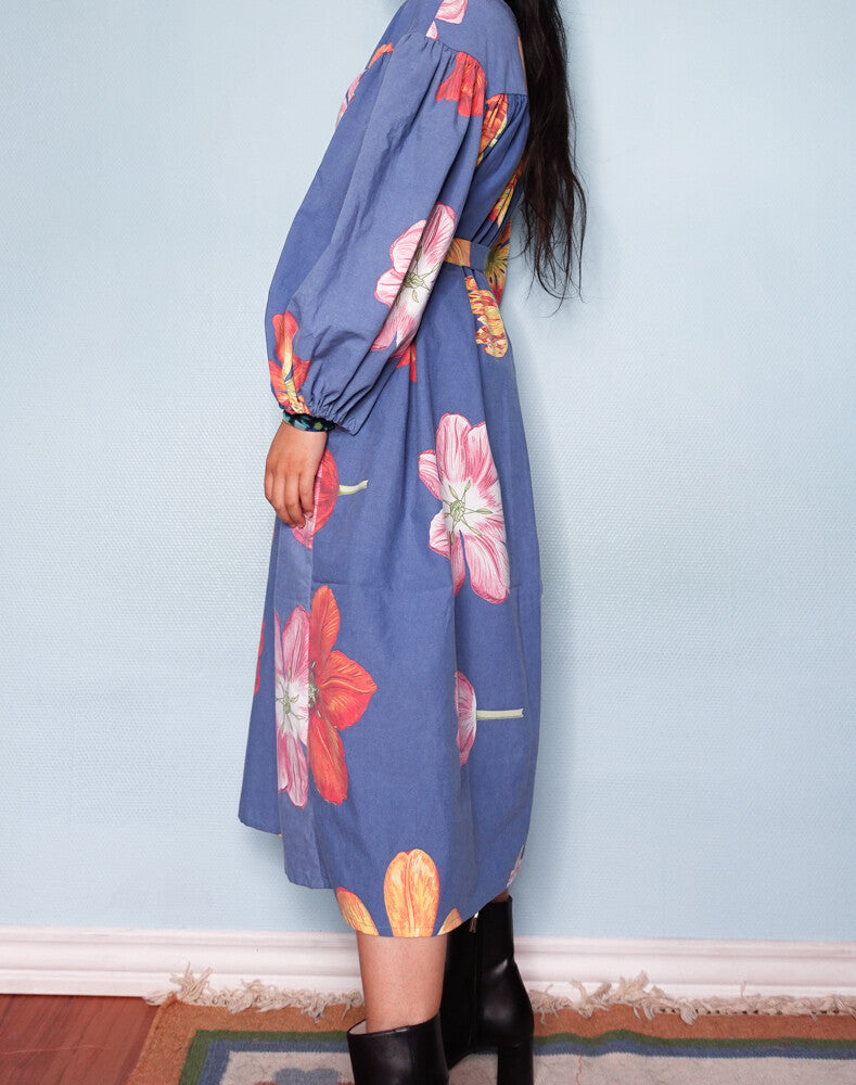 This particular dress is made of a secondhand duvet cover, 100% light cotton, amazing blue color with big flowers, a rare pattern to come across in the redesign market. The dress comes with a matching belt and the length can be altered as wished. The model is size 38/M, 166cm.